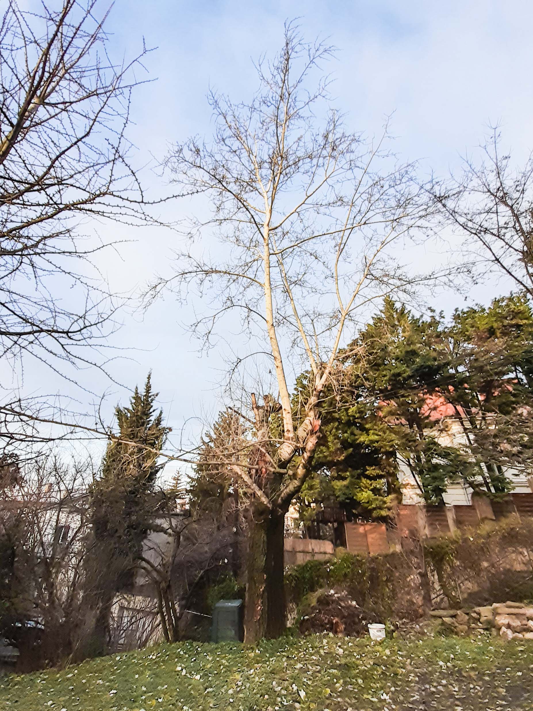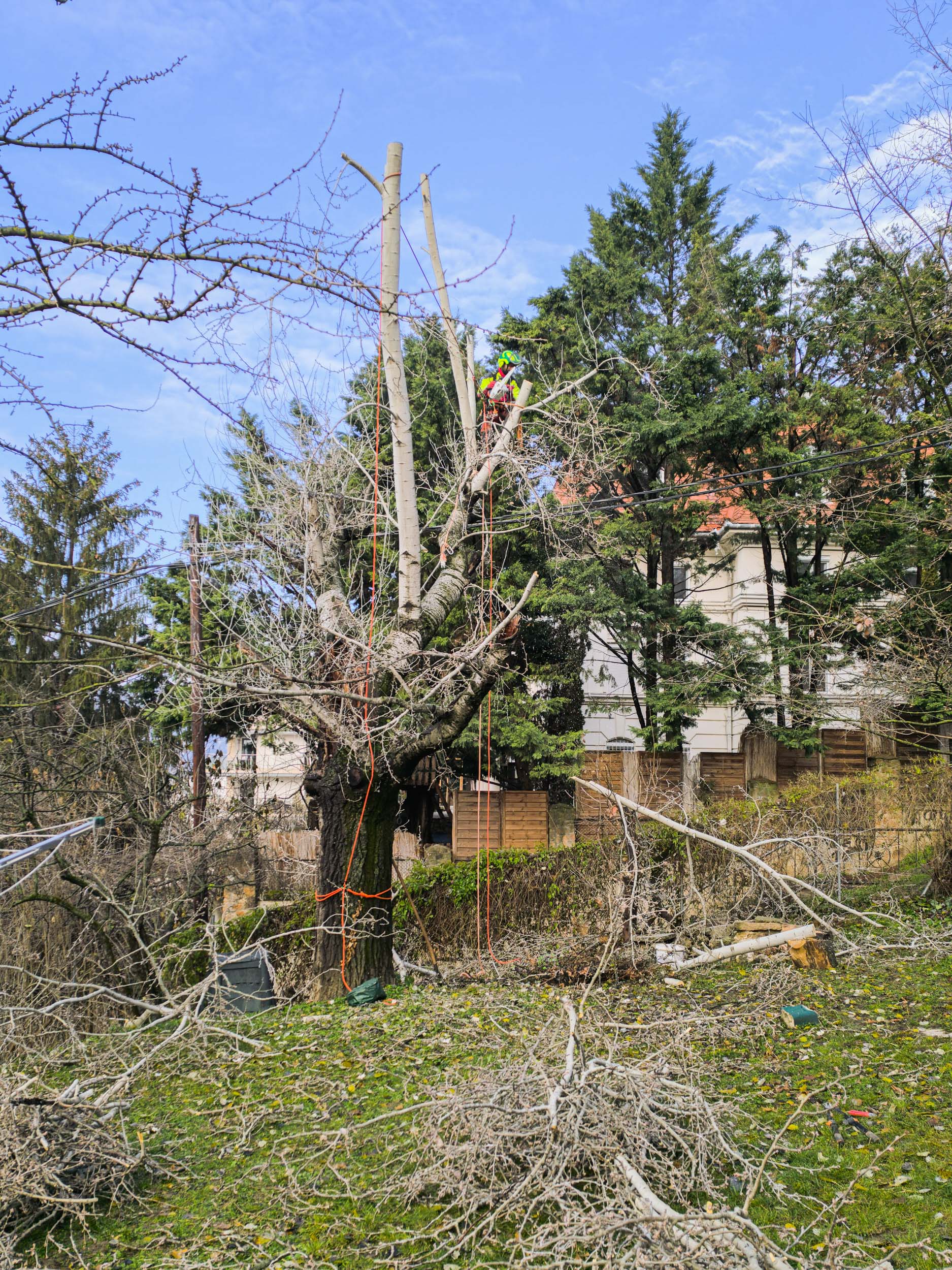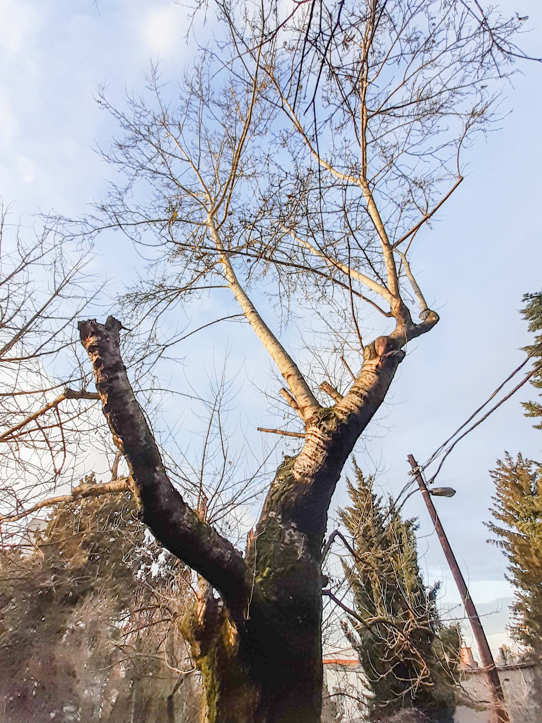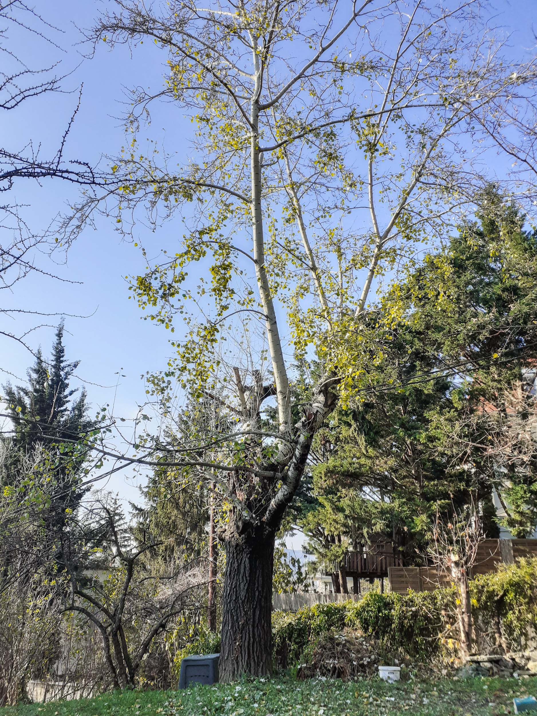 A közelében több helyi és más kertekből származó magonc cseperedik, amelyek közül valamelyik idővel átveheti a helyét, de még évtizedekig élhet velük csökkentett vegetációs módban élőhelyfaként ez az öreg nyárfa úgy, hogy most sok évig nem veszélyezteti a környezetét. A beavatkozásokkal megvártuk a levélhullást, így több száz kg tömeget dobott le dülöngélő ágairól a fa, mielőtt rámásztam, és kevésbé lengette őket a szél, mert kisebb felületen kapaszkodott beléjük, mintha tele lettek volna levéllel. Így is tengeribeteg lettem egy kicsit a fent töltött idő alatt.