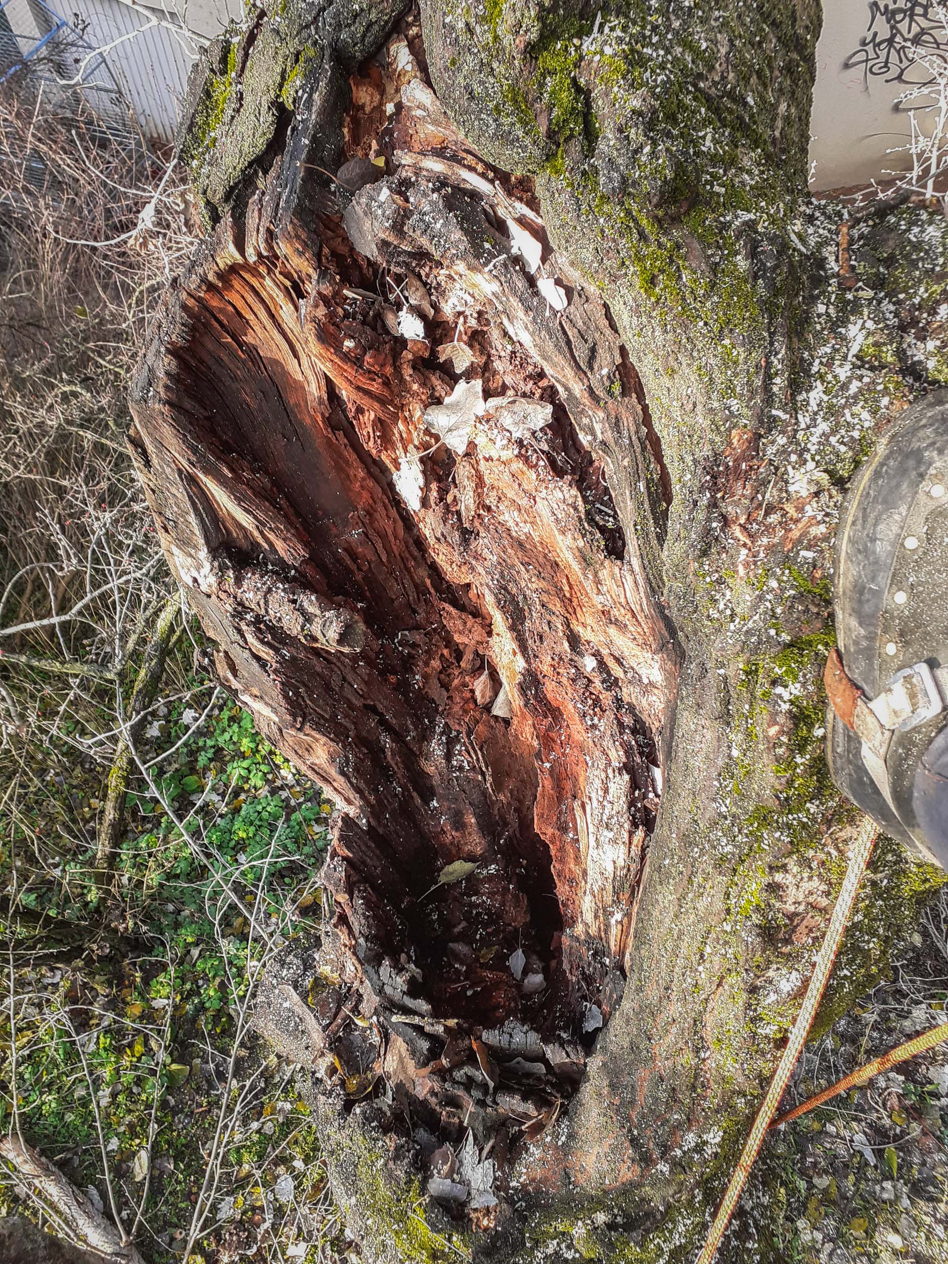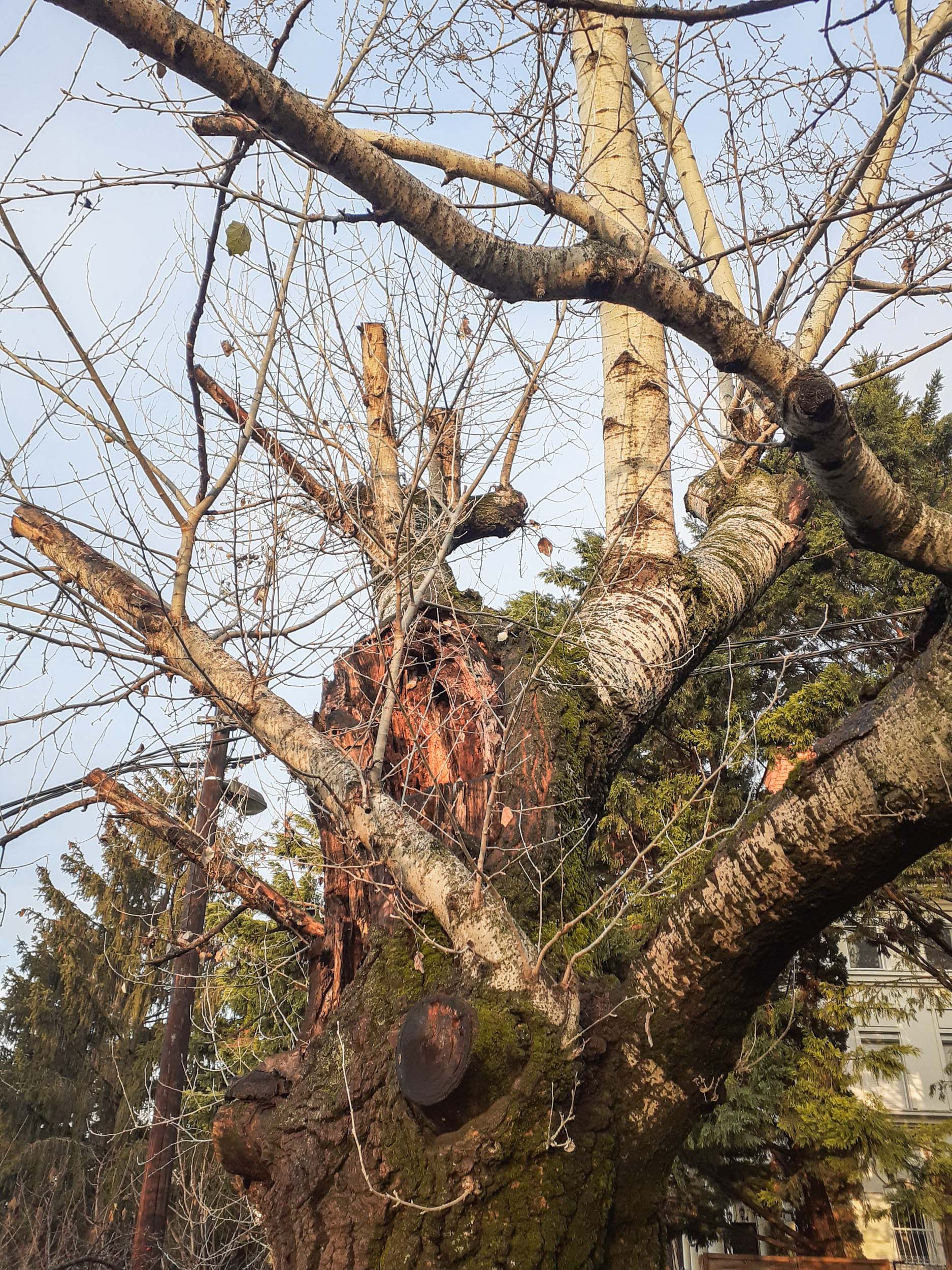 Teljesen kivágatni nem szerették volna az összképhez képest jó vitalitásnak örvendő fát, amelyen már több rovarhotel, madárodú és gombatelep is található.