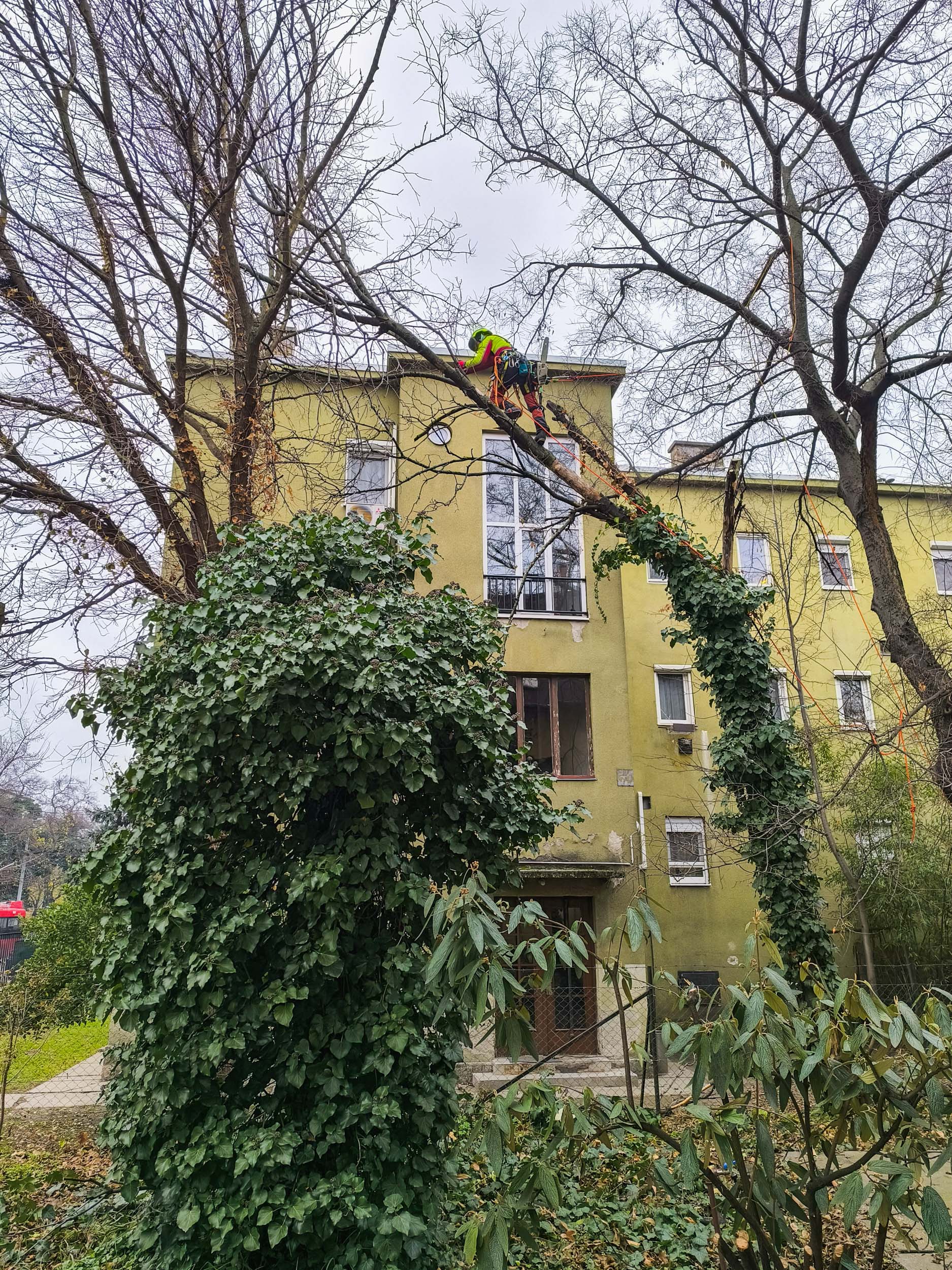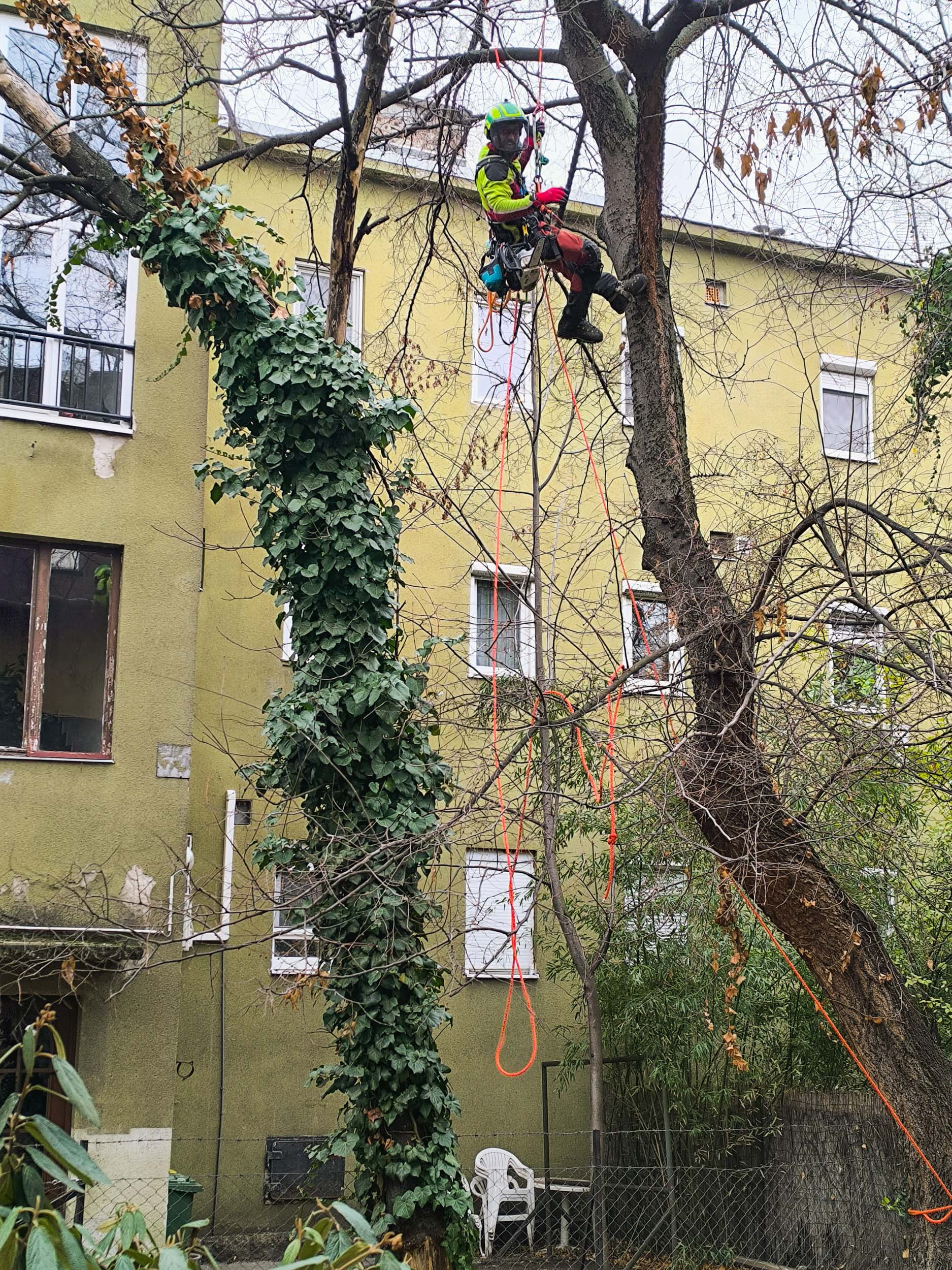 A másik juharcölöppel egyszerűbb dolgunk volt, csak fel kellett rá mászni és ledarabolni fentről. Szerencsére ebben is segített az ostorfa, nélküle nem biztos, hogy talpon maradt volna kivágás közben a fa, mert már nagyon instabil volt, talán csak a borostyán tartotta állva, úgyhogy nagyon örültem annak, hogy az ostorfa most is stabilizált minket.