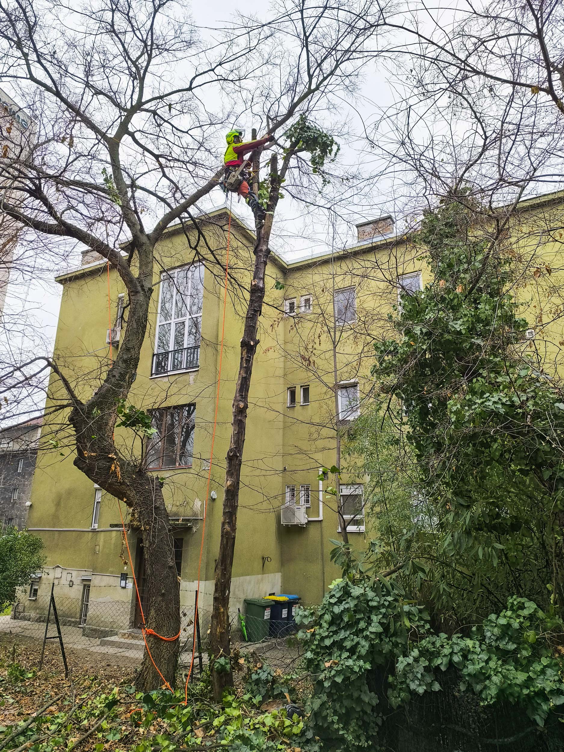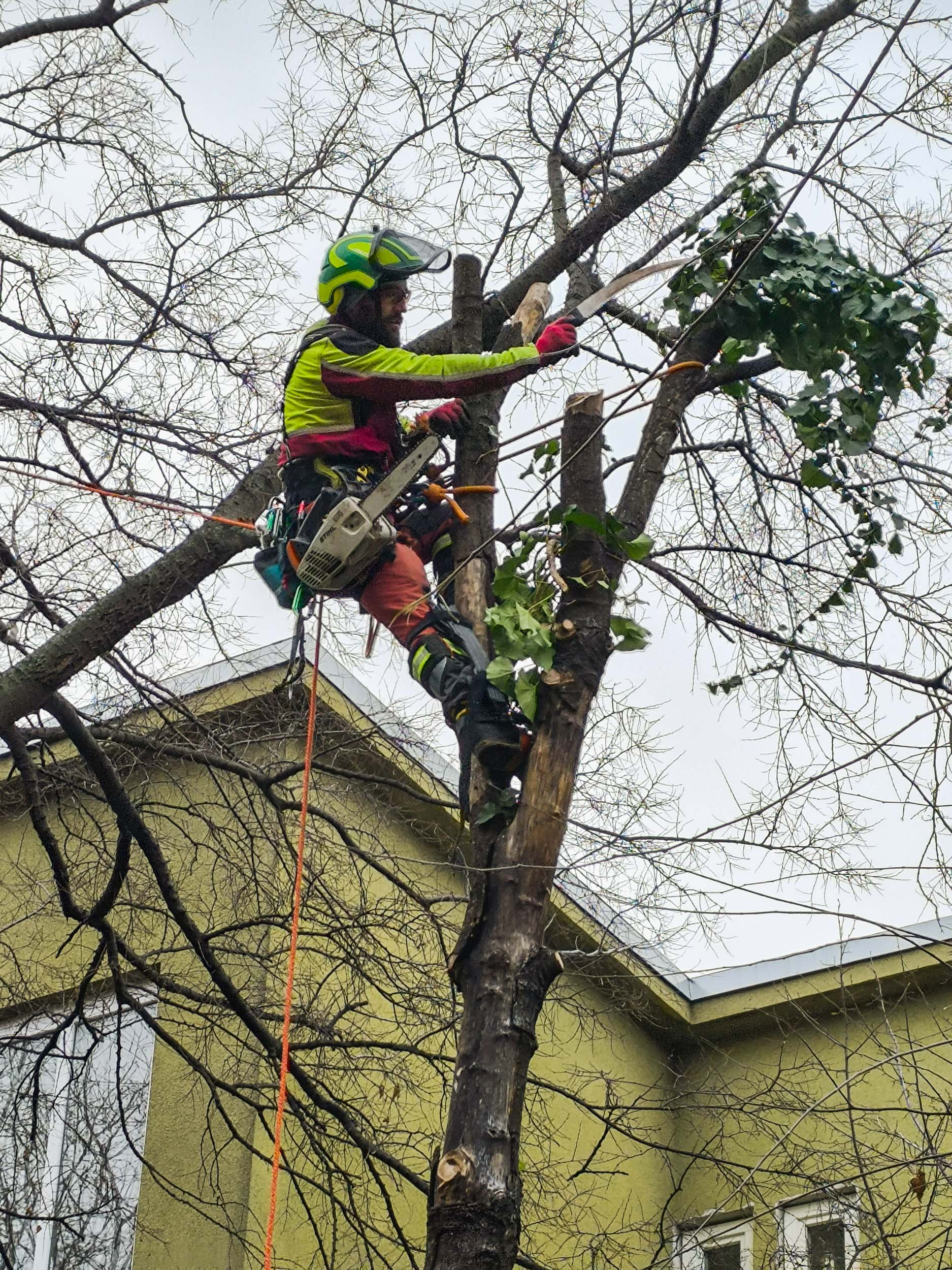 A kettétört juhar eldőlt részét két helyen kötöttük meg, az alsó egy fix kötél volt egy oldalsó ágcsonkján keresztülvezetve, a felső egy humánerő meghajtású tehereresztő, ezzel megmenthettük az eperfát és lassítani tudtuk a zuhanást, hogy elhintázhasson a kerítés fölül is a fa teteje becsapódás előtt. Óvatosan bevágtam egy kicsit a törzset a két kötési pont között úgy, hogy ne törjön ketté visszamászás közben, aztán szétpattintottuk kötélrángatásos technikával a kidőlt részt. Így a tetejének a zuhanása az ostorfán megtört eresztő kötéllel kontrollálható volt, az alsó fele pedig leborult a saját törzsére.