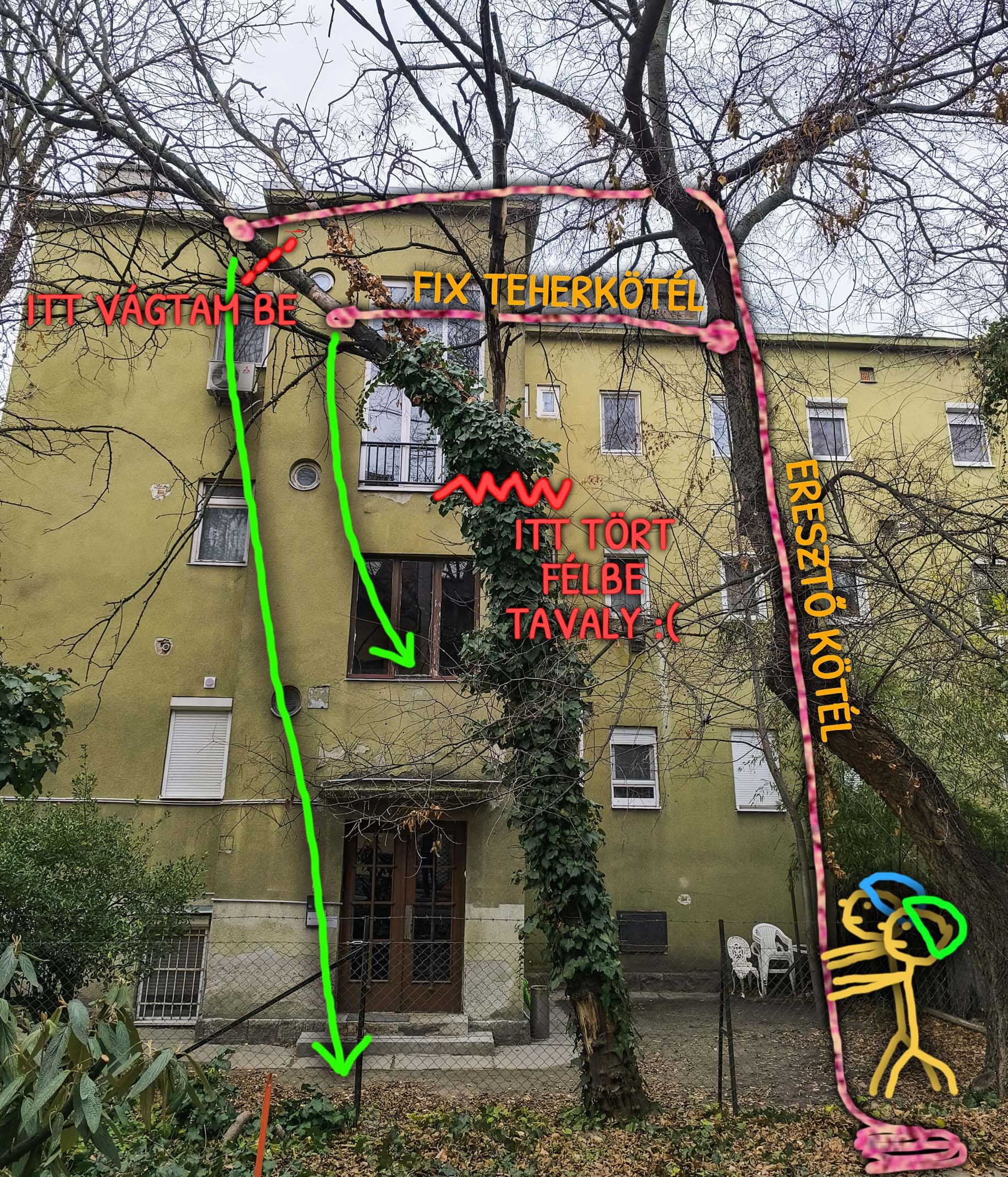 Kettejük között szerencsére van egy fura növésű, de szuper egészségnek örvendő, hatalmas ostorfa, amelyről át tudtam rájuk lógni, valamint arra raktuk a tehereresztő köteleket is a kettétört fa lehámozásához, hogy ne törjük le az eperfa ágait mi sem, meg a kerítést se zúzzuk össze. Teherkötelezés közben nem a fotózással voltunk elfoglalva, úgyhogy lerajzoltam a történteket.