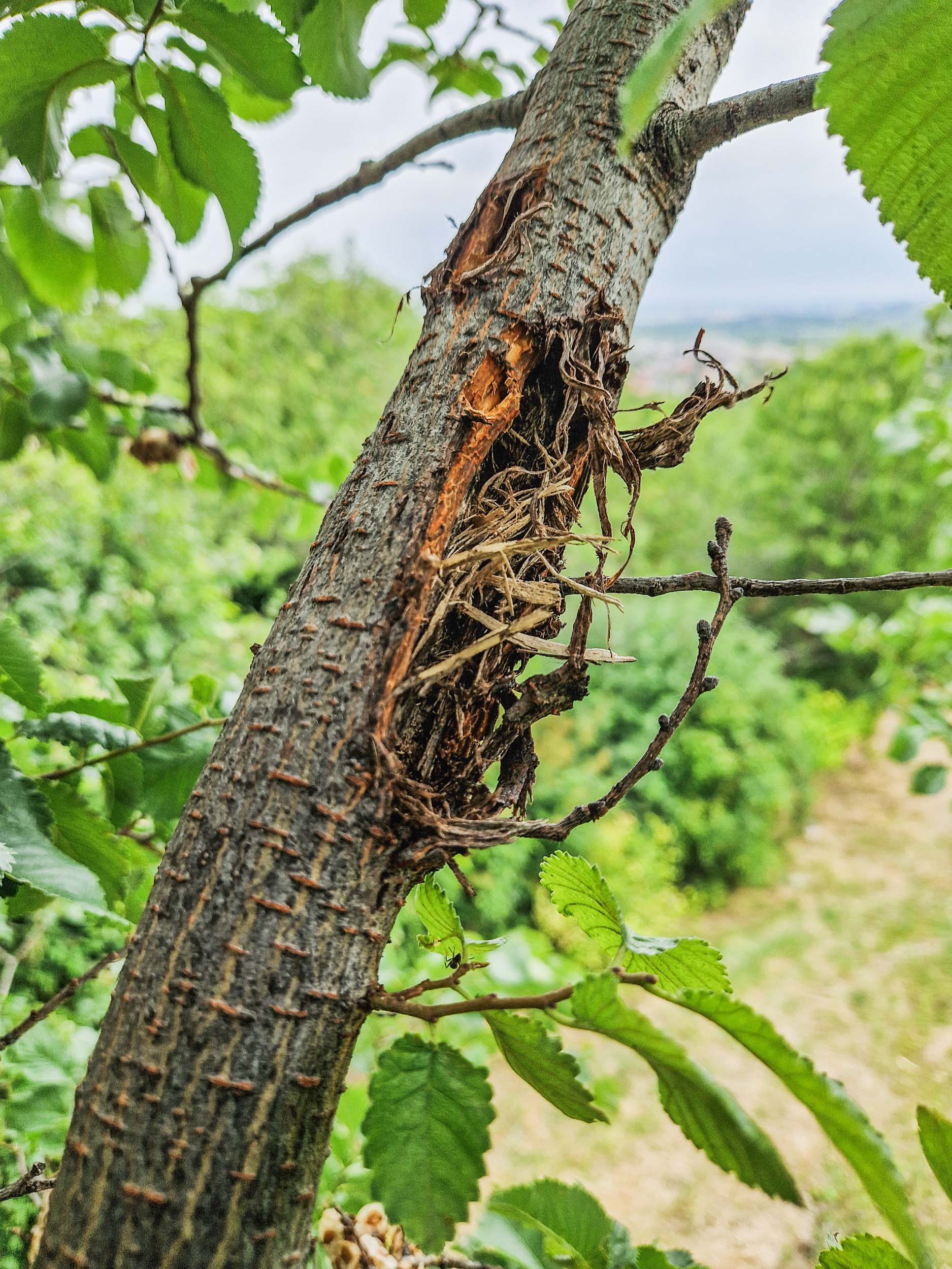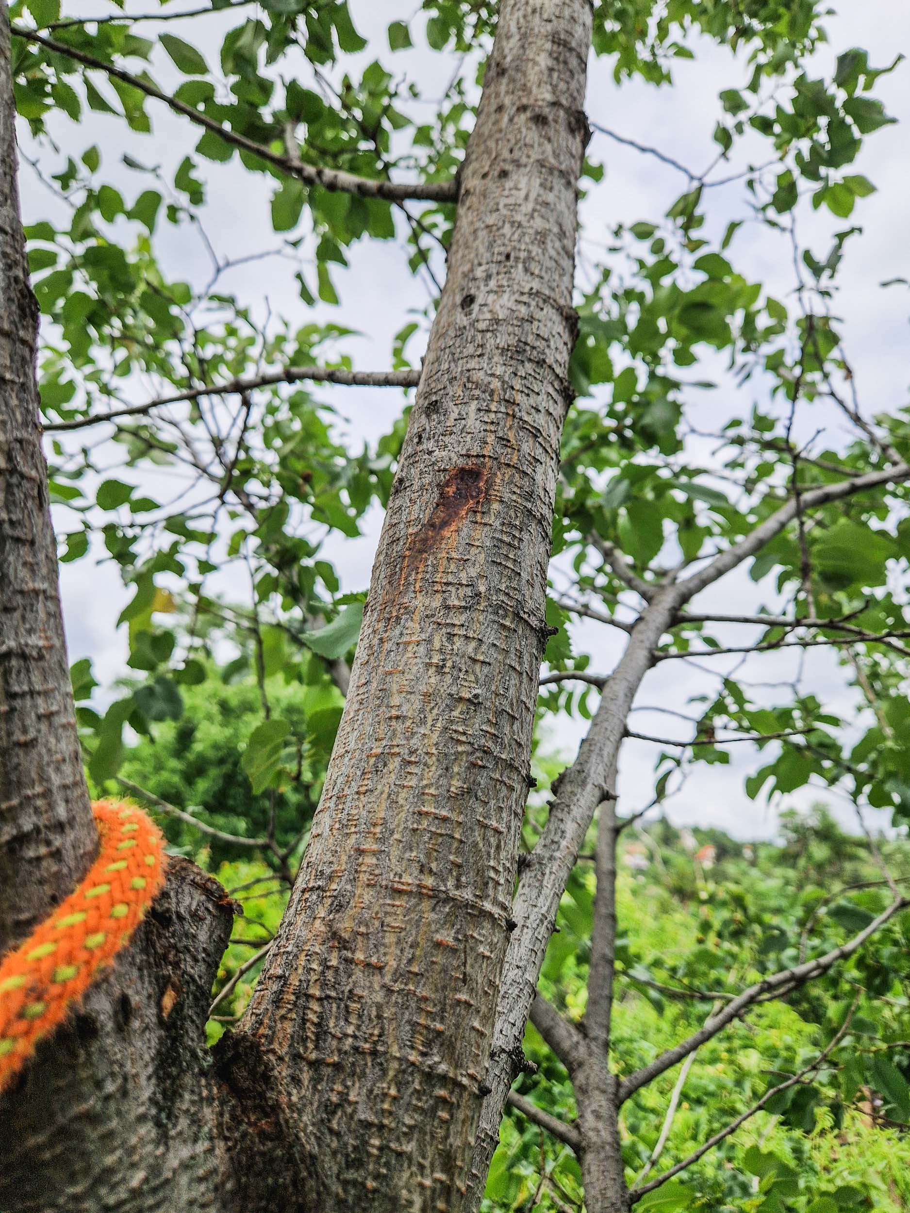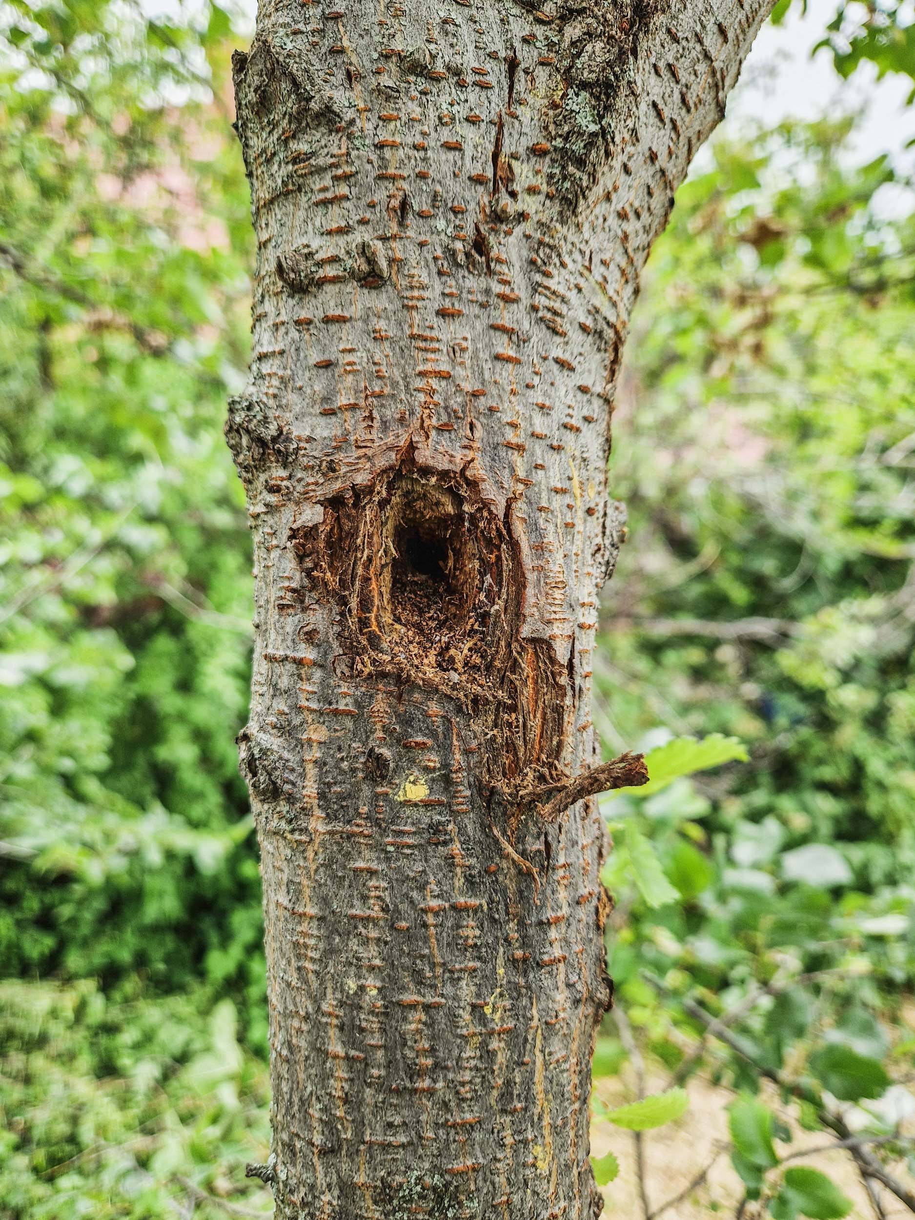 Néhány ágának voltak már belül is lakói, ezeken a harkályok is elkezdték már a bányászatot, de kisebb sebek ejtésével még időben le lehetett metszeni őket, így nem történtek a fán drasztikus beavatkozások.