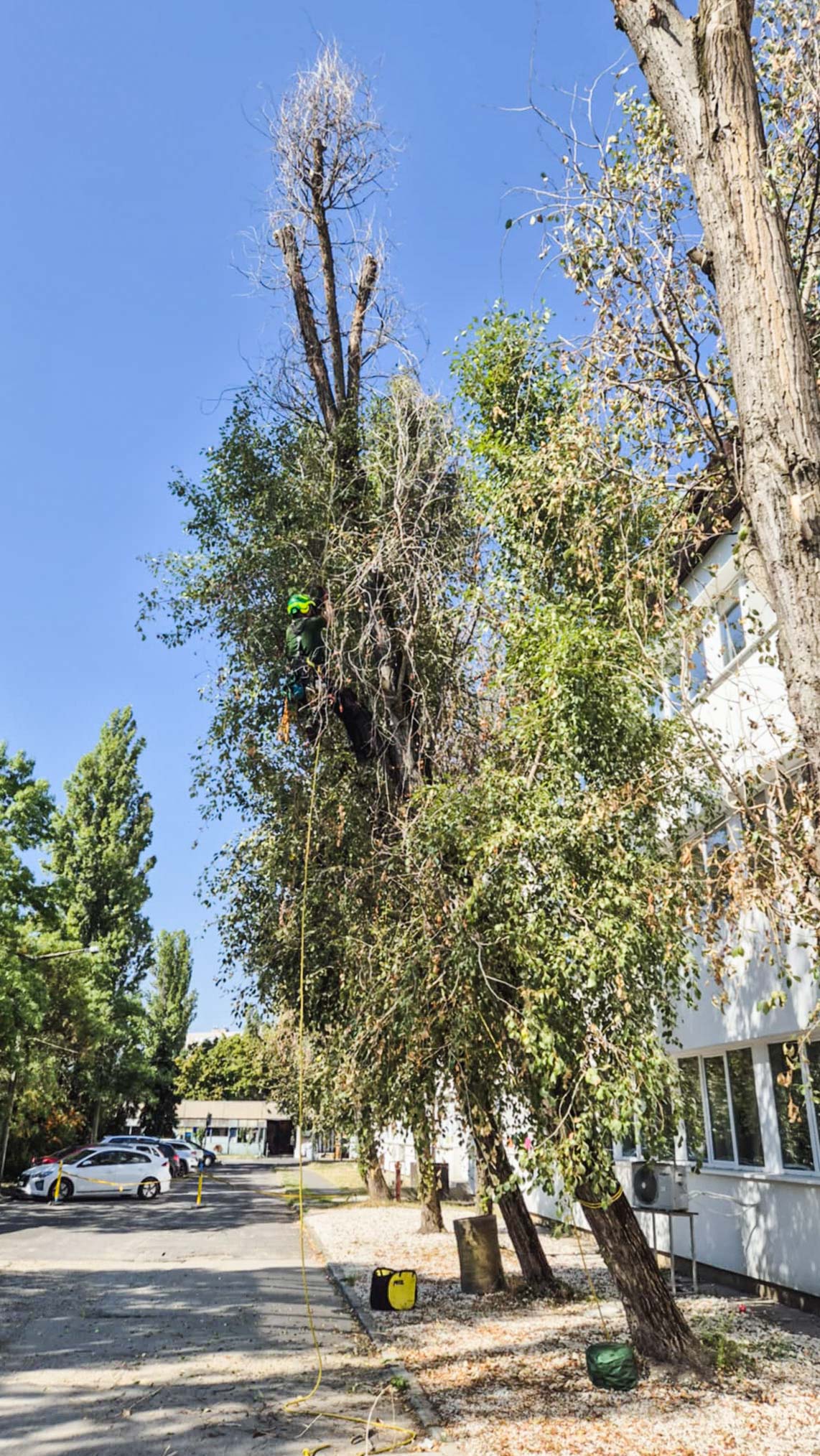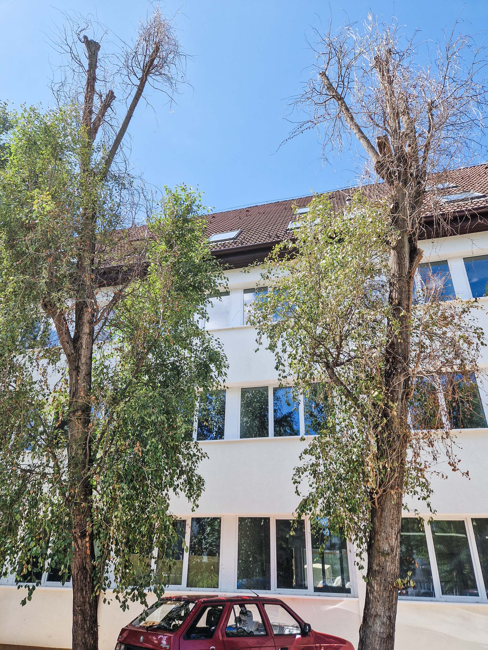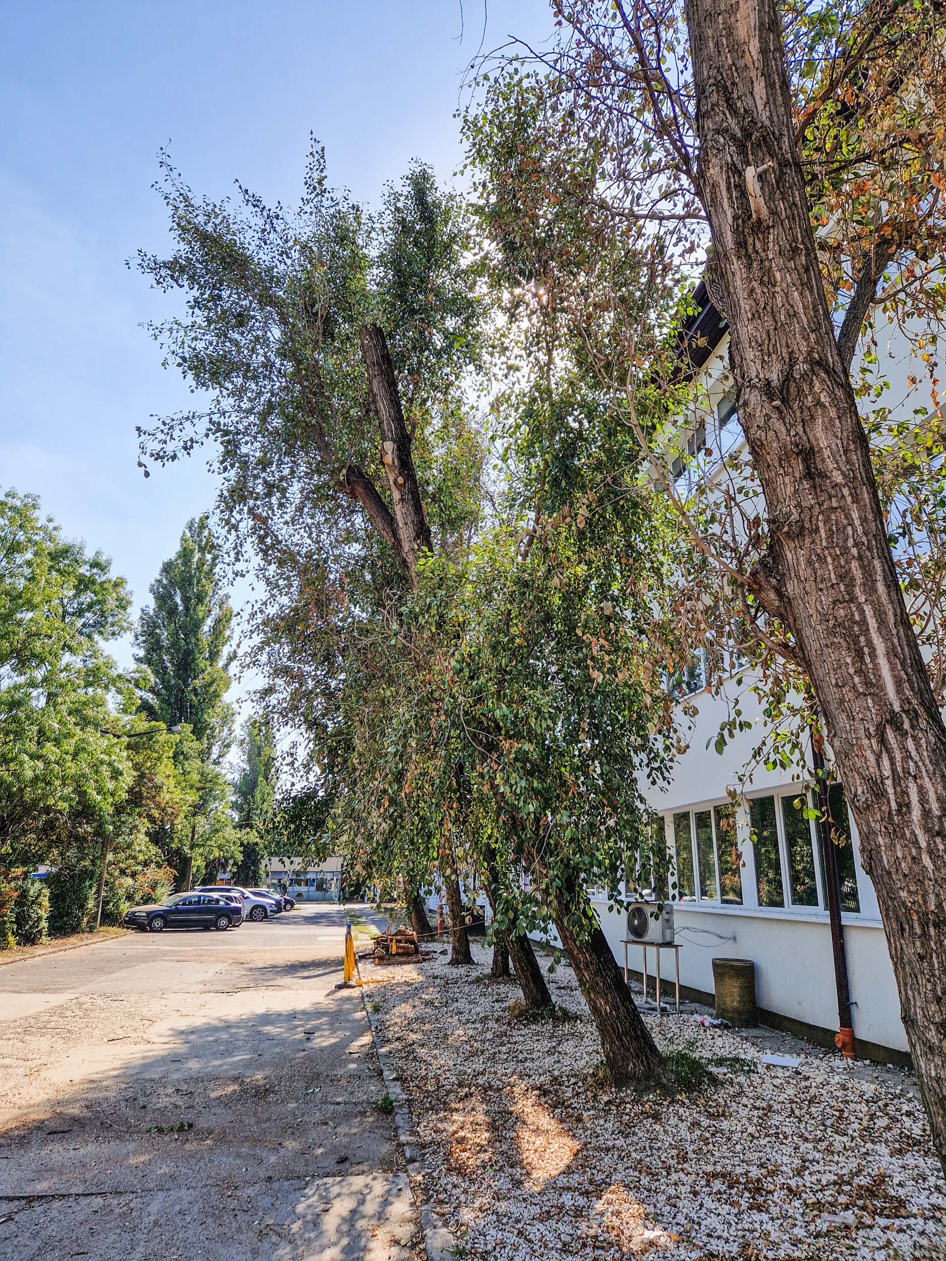 Egyszer nagyobb nyárfaszárazolásokba kezdtünk egy ipartelepen. Örültünk a felkérésnek, mert a szárazolásukra és túlélésük segítésére kértek fel minket, azt szeretnék, ha még sokáig ott lennének. Idén nyáron ez a fiatalabb fasor is elkezdte feladni, ahogy sajnos rengeteg náluk jóval egészségesebb nyárfa is feladta az elmúlt években. Látványos volt, hogy náluk idősebb szomszédaik a telep egyéb részein sokkal jobb vitalitásnak örvendenek, csak egy-egy száraz ág van rajtuk itt-ott. Ők viszont a felújított épület mellett nem örülnek az új homlokzatnak, a murvának és az ablakok által visszatükrözött napsütésnek sem. Már erősen vissza is voltak csonkolva (ezt ugye sokan ifjításnak vagy fiatalításnak hívják, hmm).