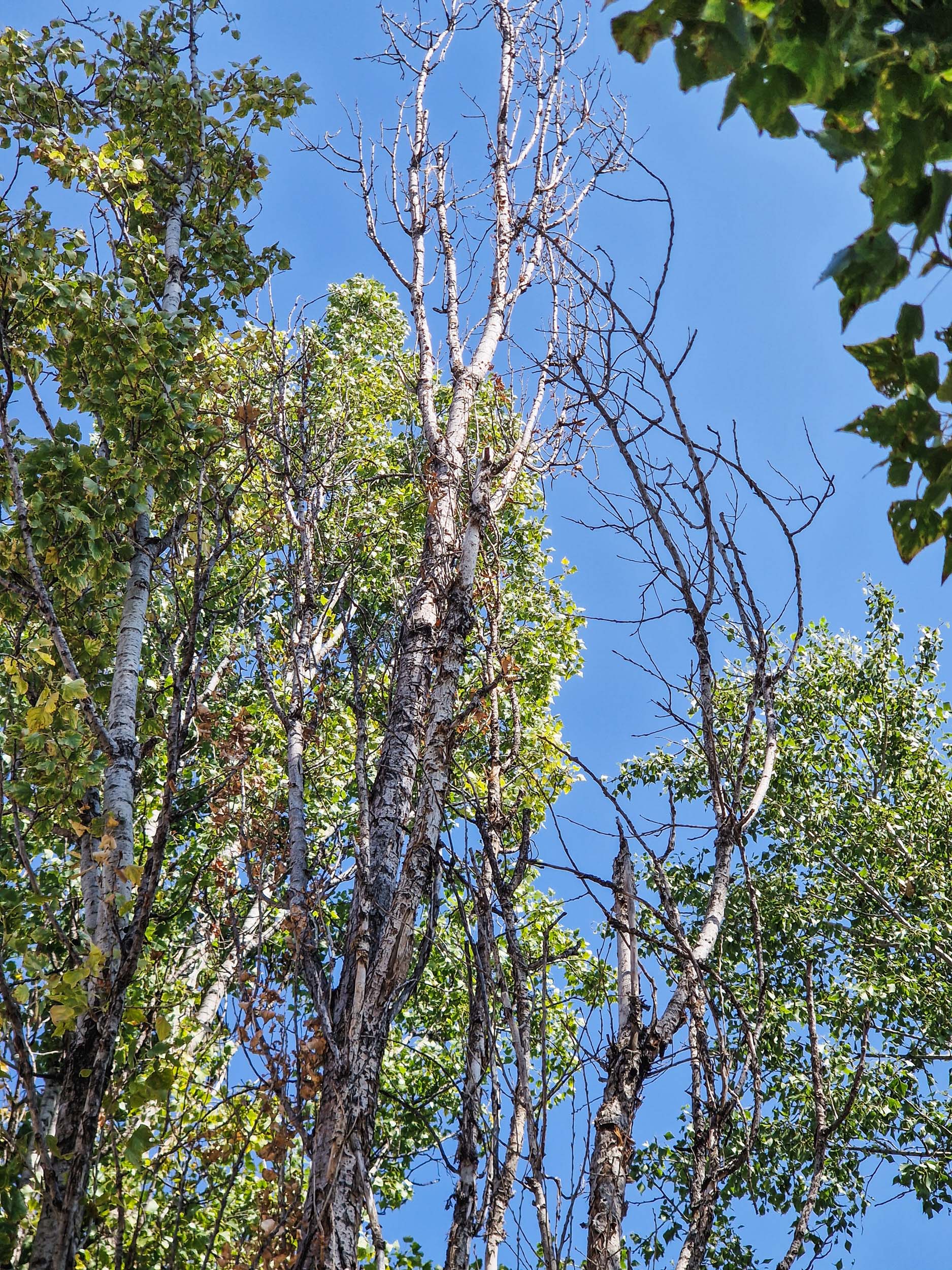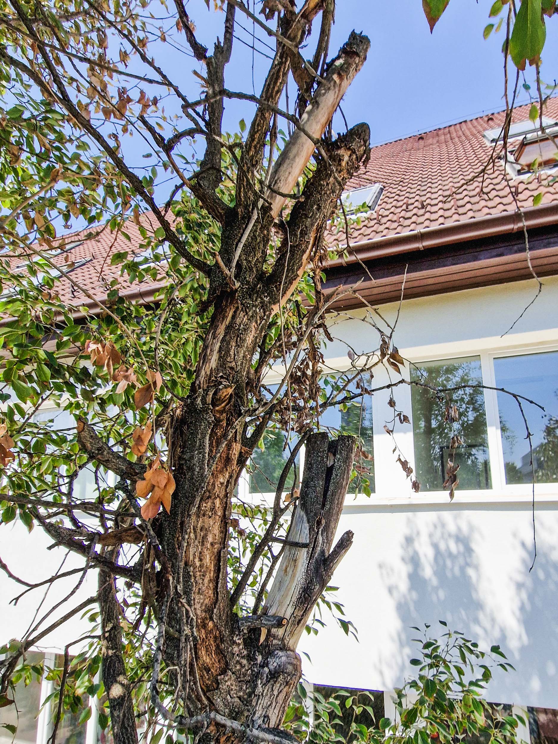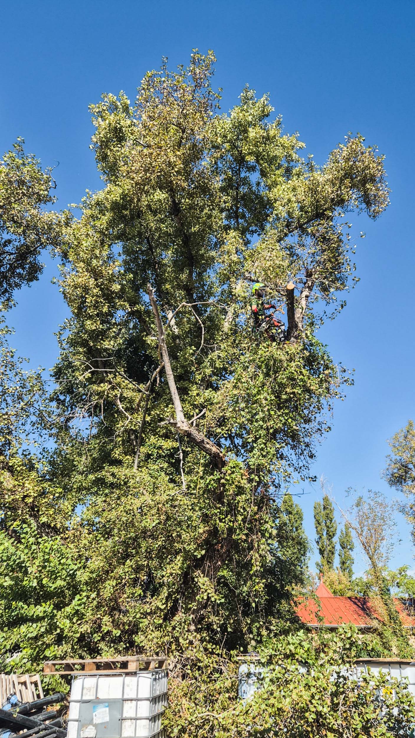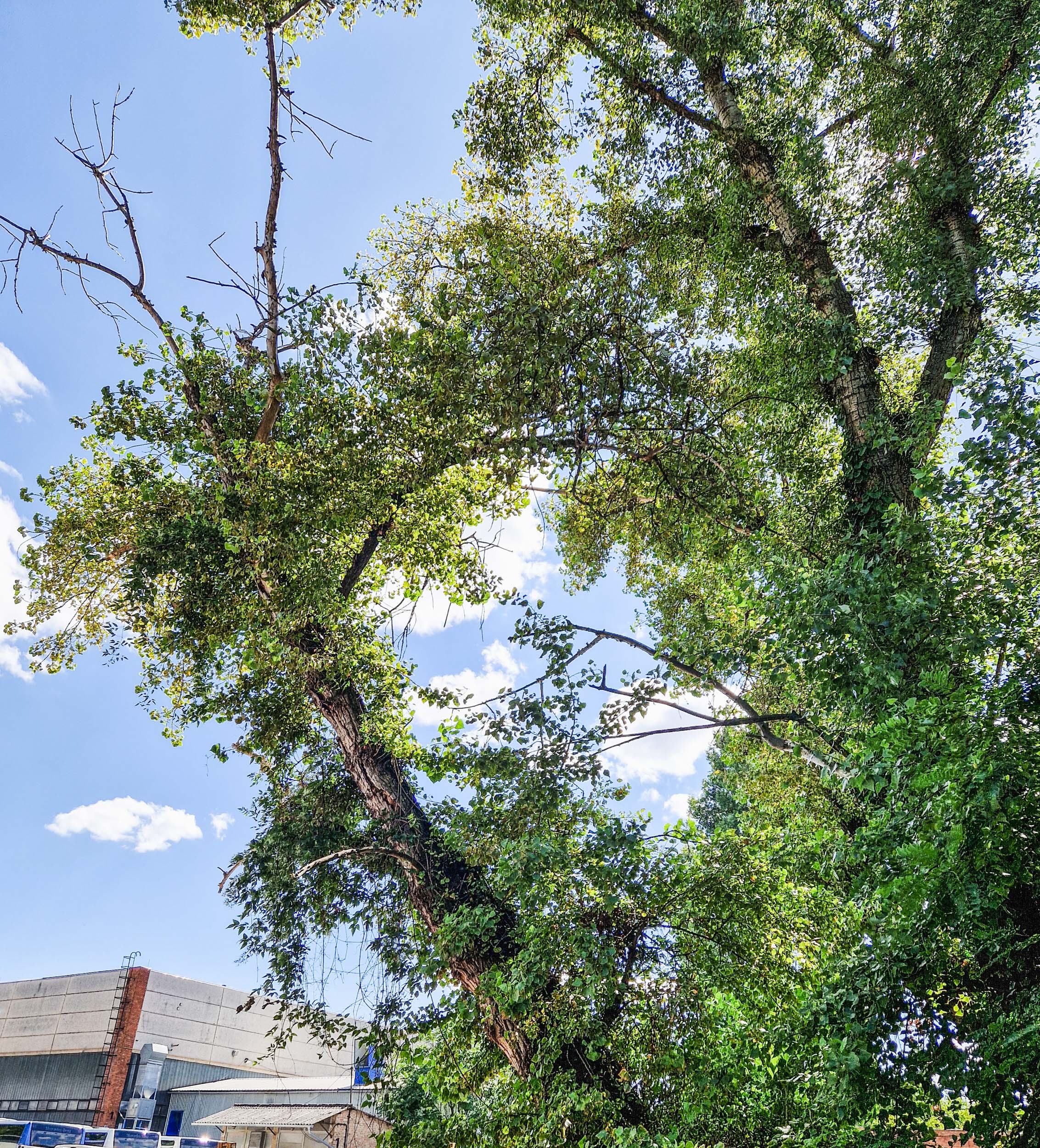 Egyszer nagyobb nyárfaszárazolásokba kezdtünk egy ipartelepen. Örültünk a felkérésnek, mert a szárazolásukra és túlélésük segítésére kértek fel minket, azt szeretnék, ha még sokáig ott lennének. Idén nyáron ez a fiatalabb fasor is elkezdte feladni, ahogy sajnos rengeteg náluk jóval egészségesebb nyárfa is feladta az elmúlt években. Látványos volt, hogy náluk idősebb szomszédaik a telep egyéb részein sokkal jobb vitalitásnak örvendenek, csak egy-egy száraz ág van rajtuk itt-ott. Ők viszont a felújított épület mellett nem örülnek az új homlokzatnak, a murvának és az ablakok által visszatükrözött napsütésnek sem. Már erősen vissza is voltak csonkolva (ezt ugye sokan ifjításnak vagy fiatalításnak hívják, hmm).